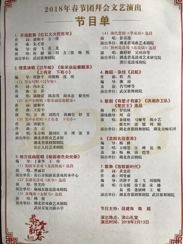 在2018年春节团拜会文艺演出的七个节目中,会员沈欣参与编导的情景对唱节目;会员陈春茸、胡承忠参演的情景演唱男女对唱《过年啦》,会员马娅琴参演的演唱歌剧《洪湖赤卫队》选段节目;会员万晓慧演唱的《京剧名段荟萃》节目;七个节目中的压轴节目是由会员周曼丽作曲、会员董研峰参演的歌舞《放歌新时代》。7个节目的精彩呈现,营造出喜庆、热烈、欢快的节日氛围。